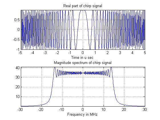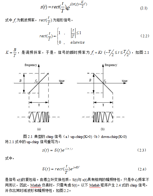 2.线性调频(LFM)信号 脉冲压缩雷达能同时提高雷达的作用距离和距离分辨率。这种体制采用宽脉冲发射以提高发射的平均功率,保证足够大的作用距离;而接受时采用相应的脉冲压缩算法获得窄脉冲,以提高距离分辨率,较好的解决雷达作用距离与距离分辨率之间的矛盾。 脉冲压缩雷达最常见的调制信号是线性调频(Linear Frequency Modulation)信号,接收时采用匹配滤波器(Matched Filter)压缩脉冲。 LFM信号(也称Chirp 信号)的数学表达式为: